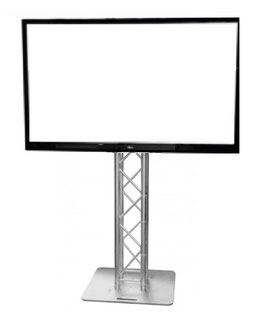 75" TV-Gerät (Art.-Nr. LIP-8056) montiert an einem Truss-TV-Ständer (Art.-Nr. LIP-8070 mit Truss, Bodenplatten und Zubehör); Eckdaten TV Gerät: Auflösung 3.840 x 2.160, Anschlüsse 2x HDMI, 1x USB, 1x digital Audioausgang (optisch), 1x Antenneneingang, 1x LAN; inkl. Auf- und Abbau